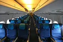 Initial design work centered on an aircraft capable of transport a maximum of 50 passengers across distances up to 1,650 km (1,025 mi), the design was later modified so that it could accommodate up to 65 seats in a five-abreast configuration, noticeably increasing its maximum takeoff weight, on the basis of market research.[5] The enlarged aircraft was roughly comparable in capacity to that of the British Vickers Viscount, a successful turboprop airliner.[6] The design was capable of speeds well in excess of turboprop-powered competitors, but retained a relatively low cruise speed in comparison to contemporary jet-powered designs, facilitating its use of a relatively straight low-mounted wing and achieving favourable low-speed characteristics as to enable the type's use from 85% of existing airports used by the F27 and the ubiquitous Douglas DC-3. According to Flying, the tentative airliner could achieve double the productivity of the preceding F27, while the company itself referred to the jetliner as a complement to its turboprop-powered sibling.[6]