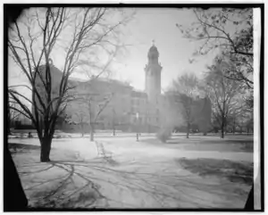 While Folger Park proper is only the north block, the block to the south, between D and E Streets Southeast is also green space. The block to the south of Folger Park was the original site of Providence Hospital. The hospital was founded in 1861 by the Daughters of Charity. They originally rented a house at the corner of Second and D Streets, but soon acquired the entire block. In 1864 President Abraham Lincoln signed an Act of Congress authorizing funds for the construction of a five-story brick Second Empire-style building with Italianate features. In 1904 the building was expanded to four times its original capacity and remodeled into a Mission style, including the 175-foot bell tower, according to the design of architect Waddy Butler Wood. With the hospital dominating the area, Folger Park was originally known as Providence Hospital Square or the Square North of Providence Hospital.[2]