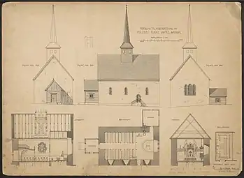 The earliest existing historical records of the church date back to the year 1341, but the church was not new that year. The church in Follebu is a stone church that was built from 1260 to 1300. It is a rectangular Gothic structure. Stone churches in the Oppland region were quite rare in the middle ages, but Gausdal had two stone churches built in the 13th century and both have survived to this day. The church is not huge, but the walls are very thick: 1.75 metres (5 ft 9 in) in the west wall and approximately 1.55 metres (5 ft 1 in) in the other walls. This gives an interior floor area of about 14 by 7.65 metres (45.9 ft × 25.1 ft). The internal height along the wall is about 6.4 metres (21 ft). The altar and the pulpit have rich acanthus ornamentation created by Eistein Kjørn.[3] There is a cemetery around the church. In 1686, a small sacristy was built just off the choir. In 1868, the old sacristy was torn down and a new, larger sacristy was built to replace it. In 1872, a church porch was built as the main entrance to the building.[4][5]