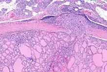 Micrograph of follicular thyroid carcinoma showing a location where the cancer grows through the fibrous capsule. H&E stain.