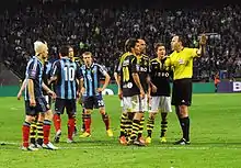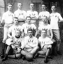 AIK started a football department in 1896 and played in the 1898 Svenska Mästerskapet final, which they lost to Örgryte IS of Gothenburg.[3] In 1899, AIK played Djurgårdens IF, in their first match, which ended 2–1 to AIK on Ladugårdsgärdet.[4] Their rivalry later became Tvillingderbyt (The Twin derby).