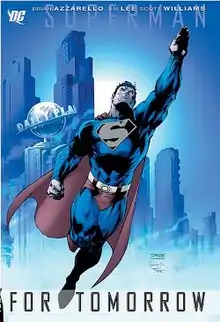 "For Tomorrow" is a 2004-2005 American comic book story arc published in Superman #204–215 by DC Comics. Written by Brian Azzarello and penciled by Jim Lee, with inks by Scott Williams, the story begins a year after a million people (including Superman's wife, Lois Lane) mysteriously vanish from the face of the earth. As the Man of Steel tries to solve the puzzle while dealing with his personal loss - as well as guilt over failing to prevent the disaster - a parallel story line concerns a priest questioning his faith and serving as Superman's confessor. This eventually gives way to a plot in which a megalomaniac bent on interplanetary conquest begins his attempt to capture his targets, and fighting through a heavy heart, Superman must stop him.