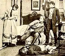 As the war intensifies and drags on, Helen loses touch with Charles. Her father, who is now away from their home serving at the front, is ordered by General Robert E. Lee to deliver an urgent, secret message to General "Stonewall" Jackson, information that may prevent the fall of Richmond, Virginia, the Confederacy's capital, to Union forces. While skirting "Yankee" lines, Colonel Randall is seen by Union soldiers, who chase him. The desperate colonel's home happens to be nearby, so Randall rushes there with the enemy in hot pursuit. Helen and her older brother Harry are at the stately residence and are startled when their father appears. Frantic to protect him, she, unlike her cowardly brother, helps to defend him and to safeguard the message he is carrying when a unit of Union cavalry arrives. Helen during the "bloody fight" that ensues is shocked to see that her beloved Charles is leading the unit.[4] Armed with a pistol, she ultimately has to choose between her loyalty to family and the Confederacy or her love for Charles. Loyalty prevails, and she shoots and kills Charles. She then faints amid the chaos, but upon awakening she finds that Confederate soldiers had arrived to chase off the remaining Yankee troopers. Although she is hailed as a Southern heroine, Helen grieves and remains devastated by the death of the man she once planned to wed, a casualty of war that she inflicted. She therefore dedicates her own remaining years to living a chaste, unmarried life.[3][5]
