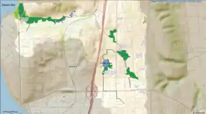 Forbes Creek is a small, moderately sloping creek wholly within the city of Kirkland, Washington.[1] From its headwaters on the Rose Hill moraine to its outlet at Juanita Bay is c. 2 miles (3.2 km) as the crow flies. The northern extent of its basin is a nearly east–west line at NE 116th Street; the eastern boundary is at the Rose Hill ridgeline, roughly north–south at 132nd Avenue NE. The southern extent is irregular trending roughly from Kirkland's high point at the northeast corner of Bridle Trails State Park (535 ft (163 m), 47°39′26″N 122°10′21″W / 47.65722°N 122.17250°W[2]) through South Rose Hill Park, to Lake Washington at 16 feet (4.9 m) above sea level.[3]