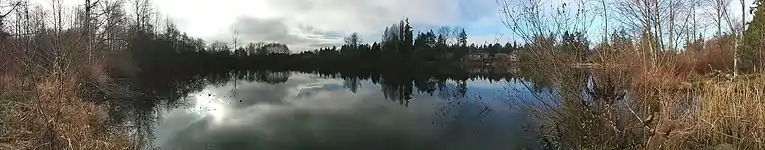 Forbes Lake (47°41′09″N 122°10′47″W / 47.68583°N 122.17972°W) is a 7-acre (2.8 ha), 30-foot (9.1 m) deep kettle lake[9][10] at elevation 246 feet (75 m) above sea level.[11] The city is developing areas around the lake under a Forbes Lake Trail and Park Improvements Project of 16 acres (6.5 ha). Wildlife in the area includes frogs and turtles in the lake; raptor bird species including hawks and bald eagles which use the tall trees around the lake; aquatic birds using the lake and surrounding wetlands include ducks and great blue herons; and mammals such as beaver, deer, and coyotes.[12]