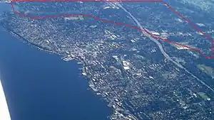 ![]() Aerial view of Kirkland with Forbes Creek watershed highlighted. North is up. Downtown Kirkland on Moss Bay is slightly left of center, Juanita Bay is at upper left. Forbes Lake is northeast of the I-405 cloverleaf. | |