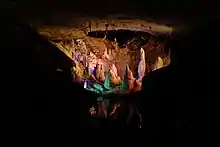 Forbidden Caverns is a set of caverns and tourist attraction in Sevierville, Tennessee, near the Smoky Mountains. Flint from these caverns was used by the Eastern Woodland Indians to create arrowheads, knives, and scrapers. The cave also contains a large wall of rare cave onyx. In the early twentieth century, these caverns were used to make moonshine. In the 1960s, plans began to excavate the cave as a natural attraction for the public. After 3 years of planning and development, Forbidden Caverns was opened in 1967.[1]