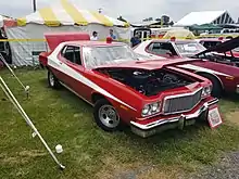 1975–1976 Gran Torinos were used in the popular Spelling-Goldberg Productions TV series Starsky & Hutch. The producers needed a flashy specialty car for the main characters to drive. Since Ford was the lease supplier for on-screen cars through their Studio-TV Car Loan Program, eventually it was decided by the producers that a bright red 1975 Gran Torino two-door would be the vehicle of choice for the pilot episode.[31] To make the Torino less mundane, a large white vector stripe was added. Aluminum 5-slot mag wheels and larger rear tires replaced the stock wheels and tires, and air shocks were added to give the car an aggressive rake. The television show became quite popular with the public, and much of that popularity was centered on the star Torino. Ford couldn't help but take notice to the public's interest in the "Starsky and Hutch" Torino, and decided to introduce a replica version of the TV car. Ford built 1,000 replicas of the "Starsky and Hutch" car in the spring of 1976.[32] Production of the replicas began in March 1976, and all were produced in Ford's Chicago manufacturing plant. This limited production package was essentially a special paint option, but required the deluxe bumper group and dual color-keyed sport mirrors as mandatory options. The TV car's slotted mag wheels were not offered by Ford, and the only sporty wheel option was the Magnum 500 wheel. They were not a mandatory option though, and these cars came equipped with wheel covers as standard equipment. When producing the replicas, Ford painted the entire car white, then masked off the stripe and painted the rest of the car the shade of bright red (code 2B) used on the 1972–75 models (and subsequently the TV cars). This color had been discontinued for all other Torino models for 1976 in favor of a different shade of red.[32] The factory replicas were close to the TV show car, but had minor differences in the stripe, and did not have the aggressive rake of the TV car. Many replica owners installed slotted mag wheels and air shocks after purchase to give the car a more authentic look. The "Starsky and Hutch" replica was available with all Torino engines. Seat colors were limited to black or white and were available with all seating trims and options. One of the factory replicas was leased to Spelling-Goldberg as a backup for the original Torinos that were created for the show.