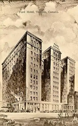 The Ford Hotel was a historic hotel in central Toronto, Ontario, Canada. It was one of five hotels in the R.T. Ford & Company hotel chain and was identical to the Ford Hotel, Buffalo and Ford Hotel, Montreal.[1] The 750-room hotel consisted of three 12-story wings connected at the rear by a perpendicular spine atop a one-story base contained the lobby, restaurants and other amenities. The structure was located on Dundas Street West, east of Bay Street. It was built in 1928 and for several decades was one of the city's most prominent hotels. The hotel was next to the Toronto Bus Terminal and provided cheap rooms for lower income travellers. It was also well known as a site for crime and vice. The Toronto Star called it the "rendezvous of choice for couples pursuing an illicit affair."[2]