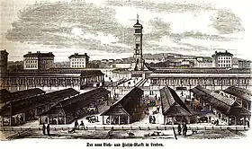 The architect was Sir Horace Jones, designer of Smithfield Market and Tower Bridge. Since time was short, Jones took a minimalist approach. The site was not cleared: the existing dockyard buildings were preserved and adapted as necessary. The dockyard had a tidal basin surrounded by three ship-building sheds, each as lofty as Charing Cross station (see title image). By connecting these together Jones obtained a cattle lairage building comprising a pentagonal horseshoe with open sides facing the river and the landing piers (see Layout). To the east another lairage shed had its own pier. Animals were provided with water troughs and hay racks, and the lairs were brilliantly lighted at night by gas lamps. There was enough covered accommodation for 5,000 cattle and 14,000 sheep.[23] Later it was enlarged, and could accommodate 8,500 cattle and 20,000 sheep.[25][26] Admiralty storehouses were converted into abattoirs,[23] comprising some 70 slaughterhouses.[27][25]