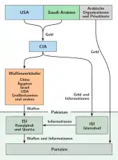After the Soviet deployment, Pakistan's military ruler General Muhammad Zia-ul-Haq started accepting financial aid from the Western powers to aid the Mujahidin.[44] In 1981, following the election of US President Ronald Reagan, aid for the Mujahidin through Zia's Pakistan significantly increased, mostly due to the efforts of Texas Congressman Charlie Wilson and CIA officer Gust Avrakotos.[45][46]
