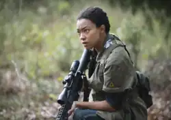 Sasha wakes up and glances at several family portraits left behind in her new house. Later that day, she takes them outside the walls to use as target practice. Finally she sits down on a tree stump, quietly saying to the walkers, "Come and get me."