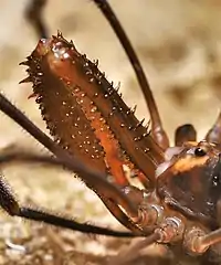 Harvestmen in the genus Forsteropsalis are highly sexually dimorphic, with males and females differing in morphology: males have enlarged chelicerae used to fight other males in competition, with a pinching claw used to grab and pin down the opponent.[4] F. photophaga males have long orange-brown chelicerae: segment I is 3.4–6.5 mm long, and segment II 4.9–9.1 mm. A distinguishing feature of this species is rows of large denticles on the second segment of these chelicerae, not seen in any other New Zealand Neopilionidae.[3]