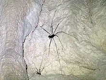 The New Zealand glow-worm (Arachnocampa luminosa) is a species of midge, whose larvae luminesce to lure flying insects into sticky silken threads. Glow-worms are notably abundant in Waitomo cave systems, and the Glowworm Caves are an international tourist attraction. Harvestmen species like F. photophaga and F. bona have been observed extracting glow-worm larvae from their silken nests on the cave roof, without being entangled in sticky threads.[1][2] Both males and females of F. photophaga have plumose setae on their pedipalps, the adhesive properties of which may help capture glow-worm larvae, pupae, and adults.[3][5]