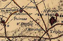 Also nearby was the Shoemaker family, which owned substantial tracts of land in both the District and in Maryland. Three forts or portions of forts were built on their property: Fort Simmons, Fort Mansfield, and Battery Bailey. Despite the loss of much of their land, the Shoemaker family continued to operate a local general store and sold various sundry items to the garrison at Fort Bayard.[4]
