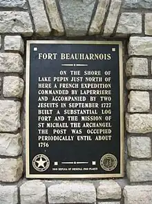 Fort Beauharnois was a French fort, serving as a fur trading post and Catholic mission, built on the shores of Lake Pepin, a wide section of the upper Mississippi River, in 1727. The location chosen was on lowlands and the fort was rebuilt in 1730 on higher ground. It was the site of the first Roman Catholic chapel in what is now Minnesota, which was dedicated to St. Michael the Archangel. The fort was named after the Governor of New France at the time, Charles de Beauharnois.