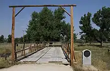 The area where Platte Bridge Station was located had been the site of various temporary Army encampments over a period of years before the establishment of the fort, or "station" itself. The fort was located on the south side of the North Platte, near the western edge of present-day Casper, at one several local points where the Emigrant Trail crossed from the south side to the north side of the river. In 1847, during the first Mormon wagon train to present-day Utah, Brigham Young commissioned a ferry at the site for later emigrants.[1] The ferry consisted of cottonwood dugout canoes and planking for a deck, with two oars and a rudder. On June 19, Young named nine men to remain to operate the ferry while the remainder of the party continued the journey westward. A group of Mormons returned to the site each summer between 1847 and 1852 to operate the ferry. The ferry was moved to a different spot on the North Platte in North Casper in 1849. It was eventually replaced with a rope-and-pulley system that could make the crossing in five minutes.