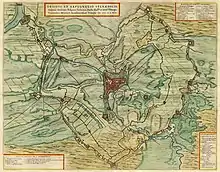 During the first years after the truce, the Spanish appeared to have the upper hand after they took Breda in 1624. Somewhat later the Dutch took Oldenzaal in 1626 and Groenlo in 1627. In April 1629 the Dutch then started the campaign that would lead to the successful Siege of 's-Hertogenbosch. Just in time the commander of Crèvecoeur got orders to arrest some ships that were planning to bring supplies to the city.[12] On 30 April 's-Hertogenbosch was closed in. Now a fleet of supply ships was sent to deliver everything that was needed for the siege to Crèvecoeur. Its role as a supply hub for the siege was further strengthened by making a ship-bridge across the Meuse.[13] During the siege the fort had at least 18 cannon, but it was not in the front line.[14] After 's-Hertogenbosch had been conquered by the Republic, Crèvecoeur continued to guard the Dieze. West of it, near Bokhoven a warship guarded the Meuse towards Holland.[15]