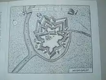 By 1735 a smaller version of the Coehoorn design was completed.[19] The fortress then had seven bastions named counter clockwise: Empel, Heel, Maase, Boeckhoven, Henriëtte, Engelen, Dies. It had two guard houses, some bomb free shelters, one big and three smaller gun powder magazines, a house for the commander, a house for the staff operating the lock, a harbor with water gate, and the church that remained from the first fortress. The idea was that the Dieze would flow freely around the fort, but that in times of war, the Dieze would be blocked, and shipping would use the locks inside the fort.[20]