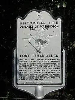 Fort Ethan Allen was an earthwork fortification that the Union Army built in 1861 on the property of Gilbert Vanderwerken in Alexandria County (now Arlington County), Virginia, as part of the Civil War defenses of Washington (see Washington, D.C., in the American Civil War). The remains of the fort are now within Arlington County's Fort Ethan Allen Park.[3][4][5]
