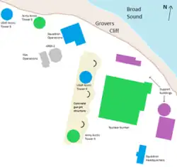 The Fort Heath radar station was a USAF radar site and US Army Missile Master installation of the joint-use site system (JUSS) for North American Air Defense at a former coastal defense site. The Cold War radar station had 2 USAF AN/FPS-6B height finding radars, 2 Army AN/FPS-6A height finders,[2] an FAA ARSR-1 radar emplaced 1958-9,[3] and an Army nuclear bunker. Arctic Towers were the pedestals for the FPS antennas[4] and radomes, while the Air Route Surveillance Radar was on a 50-foot extension temperate tower[5] adjacent to the Federal Aviation Administration building.[4]