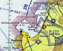 ![]() Map of Fort Ord and Fort Ord Army Airfield, labeled Parade Ground below runway from 1947 | |