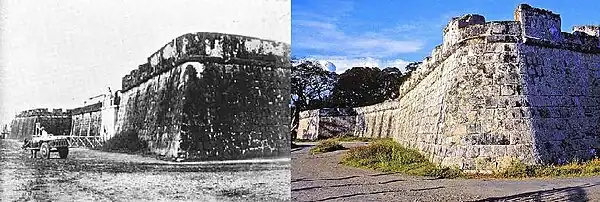 Zamboanga Fortress (now Fort Pillar), from before (left) and present (right). Note: Two different sides of the fort are shown in the photographs.