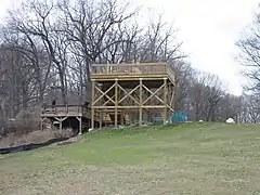 Both Fort Washington State Park and the neighboring town are named for American defenses and encampment established here in 1777, during the Philadelphia campaign of the American Revolutionary War.[2] After Washington's defeat at the Battle of Germantown, his 11,000 troops were encamped in this area from November 11, 1777 to December 11, 1777, after which time they marched to Valley Forge for winter quarters. From December 5–8, 1777, the Battle of White Marsh was fought in the immediate vicinity. The park's Fort Hill marks the spot where a temporary fort once stood. The Pennsylvania Militia under Generals Armstrong, Cadwalader and Irvine held positions on what is today called Militia Hill.[2]