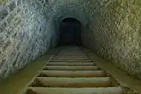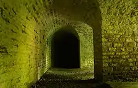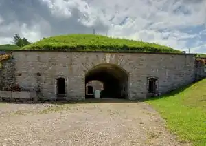 The first fortification at the Perches hill was an excavated rampart dating to 1815. A dry-masonry fort was built at the Basses Perches location in 1870 by Colonel Pierre Denfert-Rochereau during his defense of Belfort, at an elevation of 425 m.[1] The present Fort des Basses Perches was built on this site, as it had proven to be a strategically important part of the southern defenses of Belfort during the Franco-Prussian War. The roughly rectangular fort is notable for its early use of counterscarps in place of caponiers, which had been more popular until then.[2]