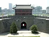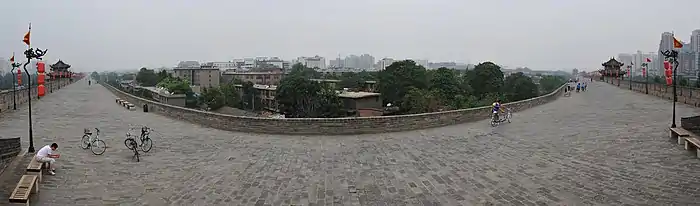 The fortifications of Xi'an (Chinese: 西安城墙), also known as Xi'an City Wall, in Xi'an, represent one of the oldest, largest and best preserved Chinese city walls. It was built under the rule of the Hongwu Emperor Zhu Yuanzhang as a military defense system. It exhibits the "complete features of the rampart architecture of feudal society".[1] It has been refurbished many times since it was built in the 14th century, thrice at intervals of about 200 years in the later half of the 1500s and 1700s, and in recent years in 1983. The wall encloses an area of about 14 square kilometres (5.4 sq mi).