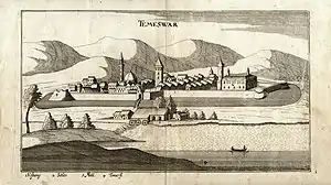 Evliya Çelebi visited Timișoara many times between 1660 and 1664 and also recorded a description of what he saw.[109] The counterguard and the fortifications with palisades were made in the second half of the 17th century. Therefore, it is considered that the names Palanca Mare and Palanca Mică date from this period.[110] In 1686, Timișoara Fortress was prepared for battle. According to an inventory of the weaponry, this included 54 pieces of artillery – of which 3 were basilisks – 1346 rifles, 402 bows and 11,760 arrows and 5,156 grenades. In the first half of 1688 the fortifications were repaired. Between the fall of 1689 and the spring of 1690, Timișoara Fortress was subjected to a long siege by the Imperials. During 1692 and 1693 the fortifications were repaired and the fortress was supplied with weapons.[111] In the fall of 1695 Sultan Mustafa II visited Timișoara and organized an expedition to capture Lipova Fortress. The weapons from the captured fortress, including 6 basilisks, were brought to Timişoara.[112][113] In 1696 the Imperials, under the command of the Electorate of Saxony Frederic August, besieged Timișoara again. However, they were defeated by the Turkish Army, after which the fortifications were again restored.[114] Although they kept repairing the fortifications, they were of earth with wood-plated parapets, unable to withstand modern artillery. Of the buildings only the castle, the mosques and the walls surrounding the castle and the fortress (the southern part of the city, the Angevin fortress) were made of masonry, the rest of the buildings were made of wood and thatch and so burnt easily.[112][87]