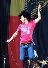 O'Rourke and Bixler-Zavala formed Foss along with Mike Stevens and Arlo Klahr.[3] They took the name "Foss" from the Icelandic word for "waterfall".[9] The members of Foss formed their own label, Western Breed Records, and issued a 7-inch record, titled The El Paso Pussycats.[10] Reportedly titled after a failed television pilot about crime-fighting women, The El Paso Pussycats shows O'Rourke wearing a floral-pattern dress on its cover.[11][12] The dress belonged to Maggie Asfahani, O'Rourke's girlfriend at the time, who later said "There's nothing particularly complicated about it—we were all hanging out, and someone thought it would be funny if we switched clothes, the girls and guys. That was all, just being different."[13] Other Foss recordings included a self-titled demo and a full-length album, Fewel Street (sometimes spelled Fewell or St.).[14][15][16] The label Western Breed later issued some of the earliest releases by Bixler-Zavala's band At the Drive-In.[10]