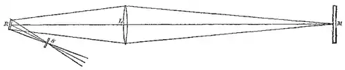 However, if the mirror R is rotating, it will have moved slightly in the time it takes for the light to bounce from R to M and back, and the light will be deflected away from the original source by a small angle, forming an image to the side of the slit.[8]