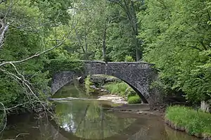 Fountain Creek Bridge is a limestone arch bridge which crosses Fountain Creek near Waterloo in Monroe County, Illinois, USA. The bridge was constructed in 1849 and served as a road bridge until the 1920s, when Illinois Route 156 opened on a new bridge. During the nineteenth century, stone arch bridges were commonly built in regions with stone quarries, such as Monroe County; roughly 100 stone bridges were built in the county. The Fountain Creek Bridge is the largest remaining stone arch bridge in the county and the second-largest which was only used by road traffic in the state.[2]