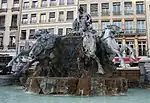 The city of Bordeaux originally commissioned a monumental fountain for the 100th anniversary of the French Revolution from Frédéric Auguste Bartholdi, the sculptor who had made the State of Liberty. The statue was finished in 1889, and displayed at the Exposition Internationale in Paris in that year. Bordeaux decided in the end not to fund it, and the fountain instead was placed in Place des terreaux in Lyon in September 1892. The Fontaine Bartholdi shows France as a woman driving a chariot drawn by four horses, representing the four great rivers of France.