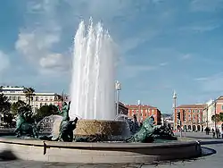 The city of Nice built monumental fountain in 1891 to honor its native son, Garibaldi, the hero of Italian independence, who was born in Nice in 1807. The fountain features Garibaldi himself, and bronze figures of France and Italy.