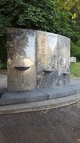 | Fountain for Company H (Second Oregon Company Volunteers) | John H. Beaver | 1914 | Dedicated to the men of Company H of the 2nd Oregon Volunteer Infantry Regiment killed in service during the Spanish–American War. It features a drinking fountain within a clamshell-shaped canopy and measures approximately 89 x 63 x 31 in.[9] | ![]() |