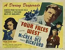 Four Faces West is a 1948 American Western film starring Joel McCrea, his real-life wife Frances Dee, and Charles Bickford. It is based on the novel Pasó por aquí by Eugene Manlove Rhodes. Its plot concerns a down-on-his-luck cowboy who robs a bank. For its genre the film is unusual in that not a single shot is ever fired.