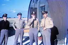 Four United States Army Air Force officers standing in front of a Nissen hut. Handwritten on slide: "Paul Fickel, Bernie Allen, Anthony Hawkins, Ethelbert Graham 503FS Fowlmere James G. Robinson".