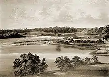 Landscape painting of The Cedars Lock and Dam in 1856 commissioned by Martin. Drawn by Samuel M. Brookes and Thomas H. Stevenson, they were part of a group paintings of river town sites and locks for the Fox-Wisconsin River Improvement Co. The view is approximately from the present Treaty of the Ceders monument on the north side of river.