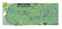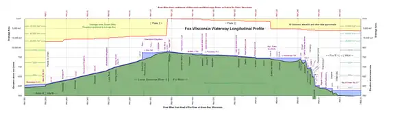 The lower Fox River flows from the natural impoundment of Lake Winnebago to Lake Michigan.[1] It extends about 39 river miles (63 km) from Menasha at the head of Lake Winnebago to Lake Michigan, falling 169 feet (52 m) from about elevation 746 feet (227 m), msl at Winnebago to 577 feet (176 m), msl at Green Bay.[2][12] The reach has a very steep and changing grade. While the hydraulic gradient averages about 4 feet per mile (0.75 m/km), there are very large falls at (using the original French nomenclature) La Grand Kaukilin (Kaukauna), La Petite Chute (Little Chute) and La Grand Chute (Appleton). The total drop of these falls is approximately the same as Niagara Falls, although over a much longer stretch.