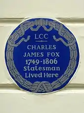 Mary Robinson moved to number 45 in 1788.[2] A plaque noting the residence of Charles James Fox, a British whig, is at number 46,[1] which is currently occupied by the Fox Club, a gentlemen's club.[3] Stephen Dowell died at number 46 in 1898.[4]