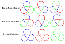 In the mathematical field of knot theory, Fox n-coloring is a method of specifying a representation of a knot group or a group of a link (not to be confused with a link group) onto the dihedral group of order n where n is an odd integer by coloring arcs in a link diagram (the representation itself is also often called a Fox n-coloring). Ralph Fox discovered this method (and the special case of tricolorability) "in an effort to make the subject accessible to everyone" when he was explaining knot theory to undergraduate students at Haverford College in 1956. Fox n-coloring is an example of a conjugation quandle.