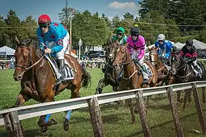Watching a steeplechase race is a rather simple undertaking, as it is the horse that comes over the finish line first that wins. However, before this occurs, several steps must be undergone. First, the horse's trainer must officially declare that the horse is on grounds for a specified period before the beginning of its race. Furthermore, the rider must report to the clerk of scales and weigh out with the minimum prescribed weight.[3] If the jockey and his gear do not meet the minimum weight requirement, lead is inserted into the saddle pad. At the specified time, the horse, trainer, and jockey must report to the paddock area or saddling enclosure. It is there that the horse is tacked up with a racing bridle and saddle, the proper girth straps, and a number cloth. The paddock judge then checks the horse as well as the jockey's silks. After approval, the horses are then paraded to the post and come under starter's orders. The starter of the race always tries to arrange a start that is fair for all of the horses and jockeys. At the drop of the tape or flags, the race begins. During the race, the horses must stay on the prescribed track, and, if obstacles are involved, they must jump over each one in the proper order. There must not be interference by horses and jockeys with the other horses and jockeys. At the end of the race, the placing judges note the horses and jockeys order of finish. At this point, the riders and their horses return to the judges’ area and wait for permission to be dismounted, though at this time no one is allowed to touch the rider or tack until he has weighed in. And finally, with no objections, and if the patrol judges report that all went smoothly and the jockeys weigh in with their original start of the race weight, the unofficial race results are declared official. At the Foxfield Races, there are no grandstands; therefore viewers are encouraged to walk up to the straight-away or fences where they are able to see the race up close.[4]