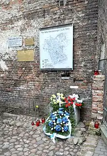 - 55 Sienna Street - the border of the ghetto was marked by the wall between Sienna 53 and 55 estates, which existed before 1940, the wall is about 3 meters high. A commemorative plaque is located on its western side. It has been placed here thanks to the initiator of the commemoration, Mieczysław Jędruszczak.[2] There is a cavity of two bricks in the wall, which were transported to the Holocaust Museum in Washington in 1989 (a copy of this fragment of the wall can also be seen in this museum). On the eastern ("Aryan") side, currently in the Henryk Sienkiewicz XII High School courtyard, is a monument to the borders of the ghetto, unveiled in January 2010.[3] Access to the fragment of the ghetto wall on Sienna 55 is possible from the side of 62 Złota Street. The city authorities undertook actions in 2017 to renovate the wall and its surroundings. The wall will be accessible from the side of the High School in 2018. A didactic and historical zone will also be created on John Paul II Avenue.[4]