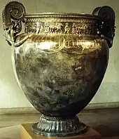 The oldest city of France, Marseille, was formally founded in 600 BCE by Greeks from the Asia Minor city of Phocaea (as mentioned by Thucydides Book 1, 13, Strabo, Athenaeus and Justin) as a trading port under the name Μασσαλία (Massalia).[2][3] These eastern Greeks, established on the shores of southern France, were in close relations with the Celtic inhabitants of France, and Greek influence and artifacts penetrated northwards along the Rhône valley.[3] The site of Vix in northern Burgundy became an active trading center between Greeks and natives, attested by the discovery of Greek artifacts of the period.[3]