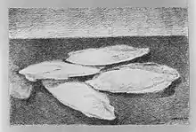 In the following years, Menzio's work developed a personal expression; some examples are "Interno" ("Interior"), now at the Galleria d'Arte Moderna di Torino and "Cappello blu", exhibited at the Royal Palace in Milan in 1929, works that showed soft brush strokes and "forms that vanished in the light". Other works such as "Nudo Rosa" or "Figura (con cappello)" (1929; now in private collections, Turin) or "Corridore podista" (1930) show the influence of Henri Matisse and Amedeo Modigliani. Between 1930 and 1931 Menzio continued his personal investigation, marked by experimentalism and restlessness, elements that were present in some paintings such as "Natura morta con ciliegie" (1931; in the Galleria d'Arte Moderna della cittá di Torino), where the rigorous and essential composition is substituted by objects that had restless and defined colors and outlines. Between 1934 and 1935 he created the frescos in the Psychiatric Hospital of Collegno and inside the Church.