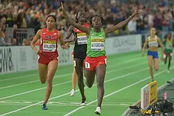 Niyonsaba wins the 800 m at the 2016 World Indoor Championships in Portland.