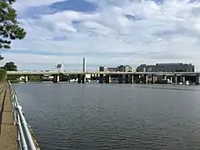 Though a Washington Channel Bridge had been proposed as far back as 1931, planning for the bridge that was built wasn't started until 1952 and all of the bridge's elements weren't completed until the 1970s.[2] In the early 1950s planners recognized the need to connect the planned Southwest Freeway in DC with Shirley Highway in Arlington to serve as part of the inner loop. This would require new bridges across the Potomac and the Washington Channel. The original 1952 proposal was to build a bridge in a straight line from 10th an F to Roaches Run. It required closing multiple blocks of Virginia Avenue to build a half circle south of Independence Avenue - thus creating a new Smithsonian site, rebuilding 10th Street and removing numerous structures.[3] By 1955, a proposal from NCPC shifted the Potomac Bridge north to 14th Street, necessitating an S-curve across the Channel Bridge and the highway on East Potomac Island. Despite opposition from the National Park Service to running the highway so close to the Lincoln Memorial, this is the design that was eventually approved.[4] After additional planning and approvals, Federal and District officials broke ground for the $8 million Washington Channel Bridge on August 20, 1959, though work on the piers had started earlier that summer.[5][6] During construction they moved the historic Maine Avenue fish market to make room for the bridge.[7] The bridge, along with the 12th Street Expressway, opened on July 31, 1962.[8] When South Dakota Senator Francis H. Case died a little more than a month before the bridge opened, a bill was introduced to rename the bridge for him in honor of his role as an architect of the 23rd Amendment which granted DC residents the right to vote for Electoral College electors, and for his years of service on the Senate Committee on the District of Columbia.[9] The bill passed in 1965 and the bridge was renamed.[10]