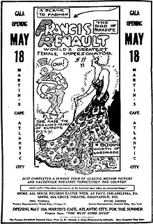 Renault first performed under the name Auriema in Providence, Rhode Island in 1911.[3] He adopted the name of Francis Renault in the mid-1910s, as he gained popularity and began touring.[3][4] During this time, he performed in Atlanta,[3] San Francisco, and Utah.[5] He primarily impersonated American singer and actress Lillian Russell.[1] By the 1920s, Renault was being billed as the "world's greatest female impersonator".[6]
